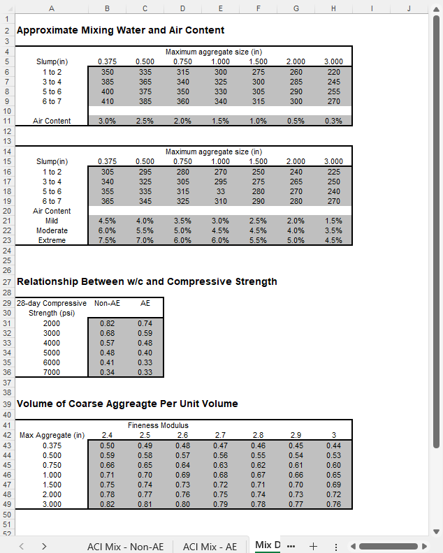 aggregate size, the desired slump, and the 28-day compressive strength) and values for