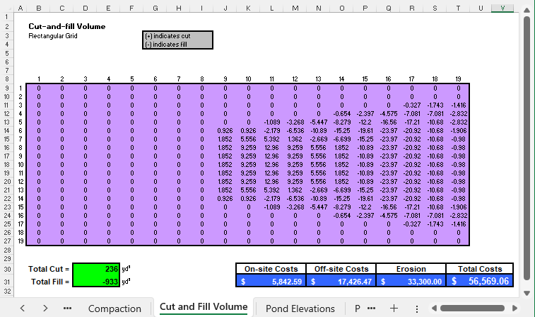 fill and (+) area is cut]. Sum the cut-and-fill volumes for all the grid cells to estimate