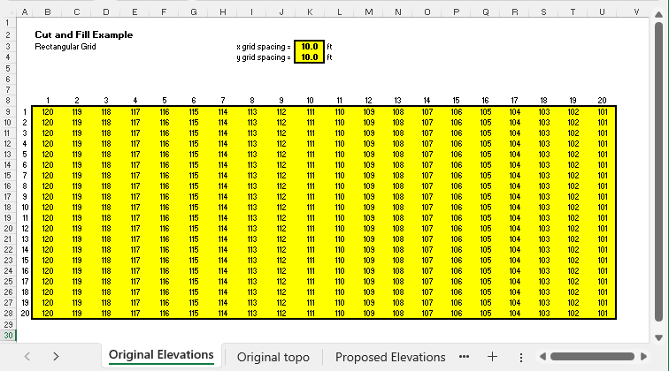 spacing of the elevation grid, the original elevations at each grid line intersection, and