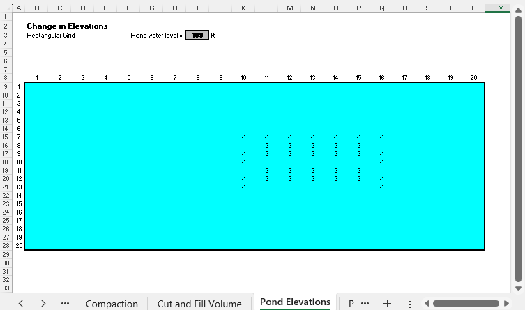 the worksheet below. Note the proposed pond elevation is given in cell I3.