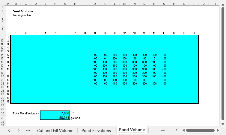 The pond volume for this example is computed in the worksheet shown below. Note the