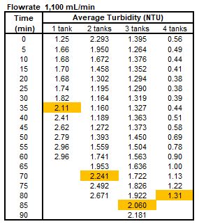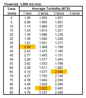 Flowrate = 1,100 ml/min Coagulant dosage = 60 mg/l Filters:
